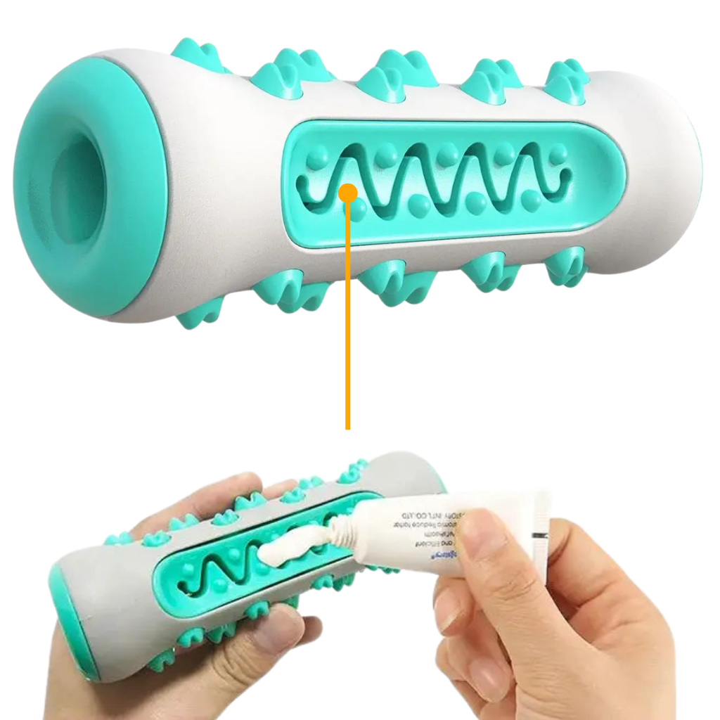 Fill the pet toothpaste into the convenient hole or apply it to the special cleaning groove and let your dog use the toy for 3-5 minutes.