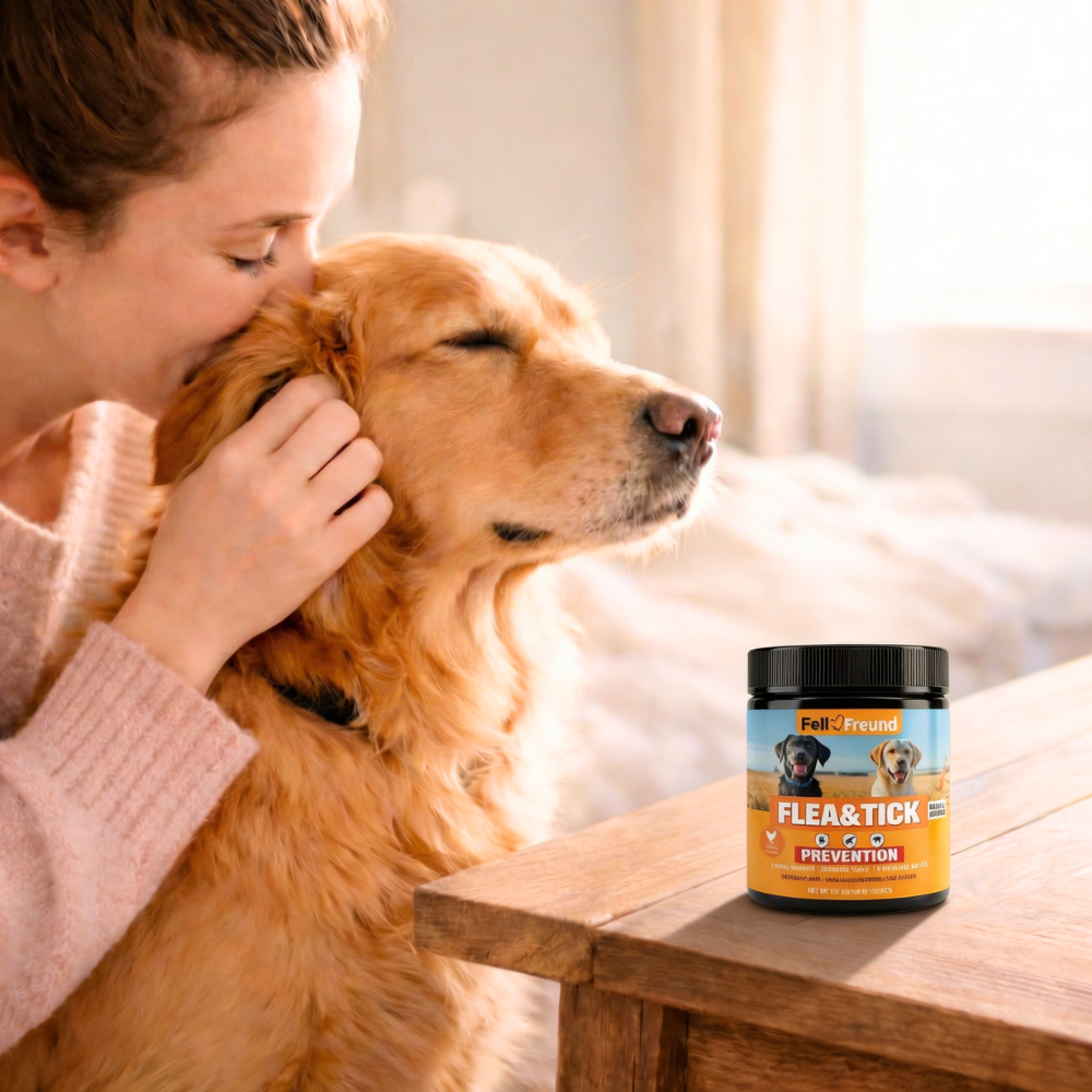 When tick season starts, every relaxing walk quickly turns into a stressful moment: You're constantly checking your dog, finding more and more ticks – and wondering how you can protect him without resorting to harsh chemicals. Our flea and tick protection chewable tablets were developed for this time of year: They support your dog's natural skin barrier from within and help his body protect itself – completely without aggressive substances.
